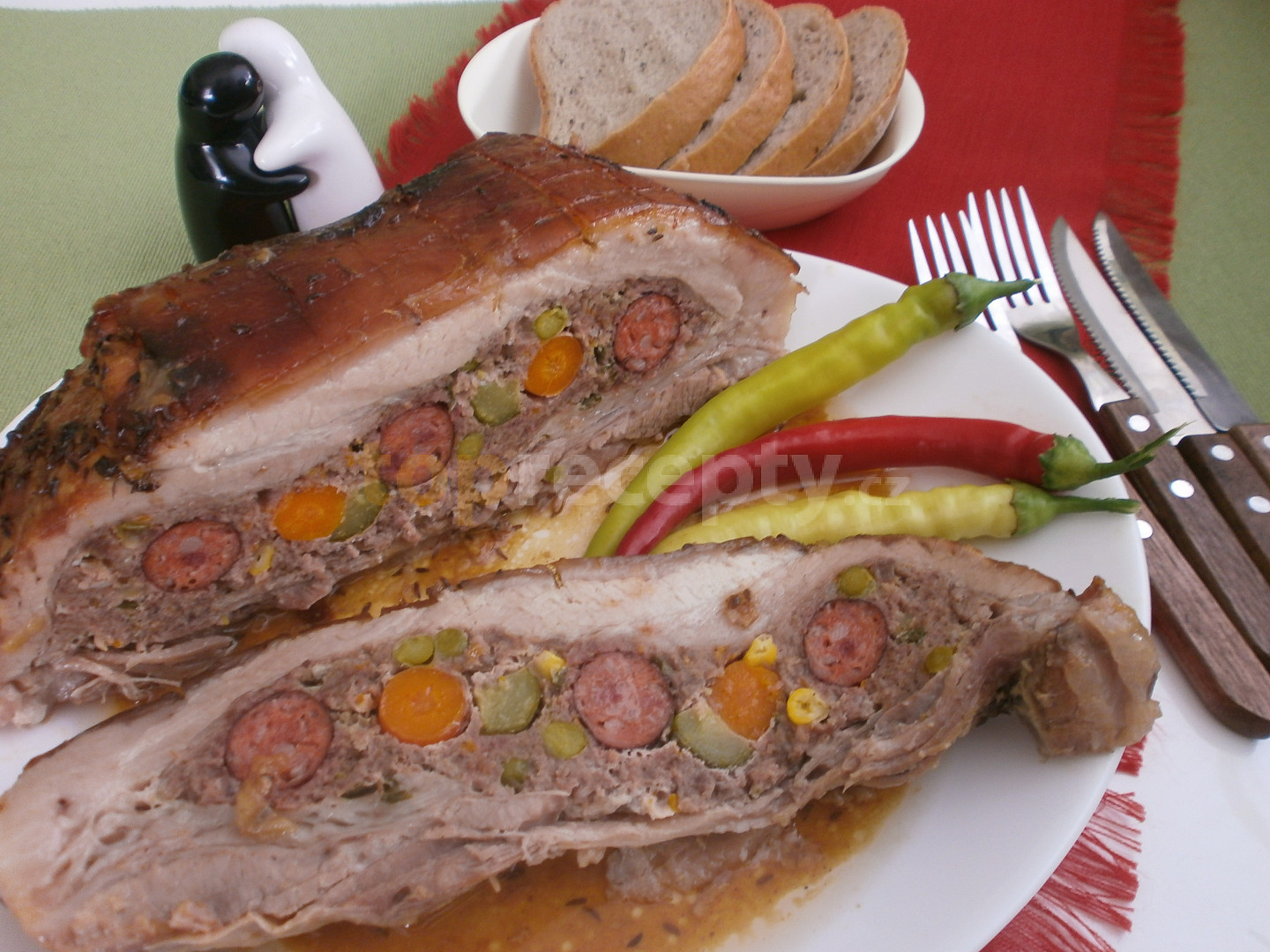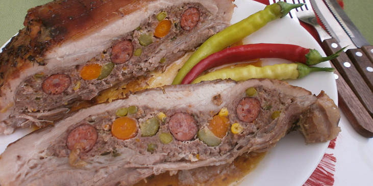bůček bez kosti, pivo světlé, cukr třtinový, omáčka worcesterová, česnek sušený, pepř mletý, olej, maso mleté, slanina debrecínská, olej, cibule, česnek, koření dekora, párky, vejce, sůl, pepř mletý, olej, cibule, česnek, voda, režná nit