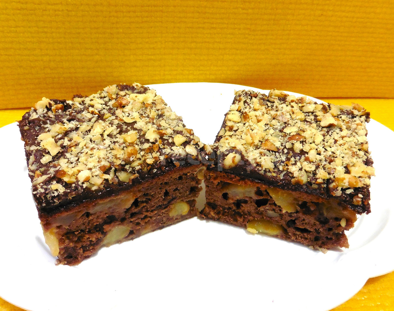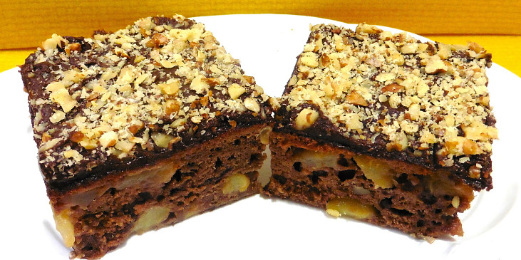 mouka hladká, mléko, cukr krupice, kypřící prášek do pečiva, cukr vanilkový, skořice mletá, ořechy vlašské, jablko, cukr krupice, máslo, kakao, rum, voda, ořechy vlašské