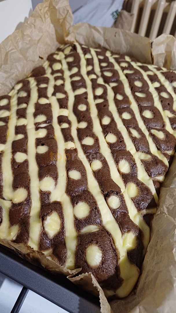 mouka polohrubá, cukr moučkový, mléko, olej, vejce, cukr vanilkový, prášek do pečiva, kakao, tvaroh ve vaničce, pudink vanilkový, cukr, mléko, máslo, mouka hrubá