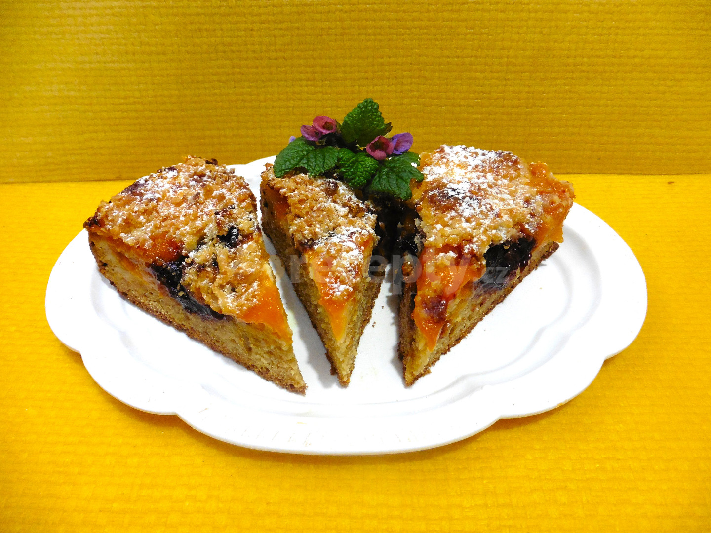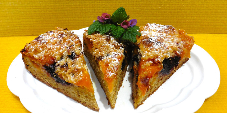 mouka polohrubá, vejce, mléko, olej, cukr krystal, kypřící prášek do pečiva, cukr vanilkový, skořice, kůra citronová, tvaroh, povidla švestková, meruňky, cukr moučkový, kůra citronová, pudink vanilkový, máslo, cukr moučkový, mouka polohrubá