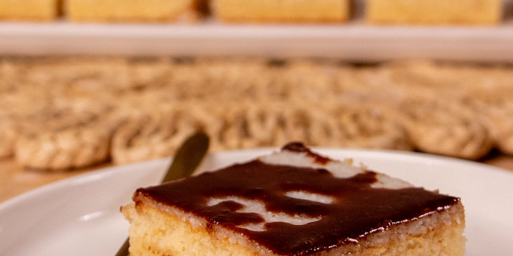 mouka polohrubá, cukr moučkový, olej, mléko, vejce, kypřící prášek do pečiva, cukr vanilkový, kokos strouhaný, mléko, voda, pudink kokosový, cukr krupice, cukr krupice, voda, čokoláda na vaření
