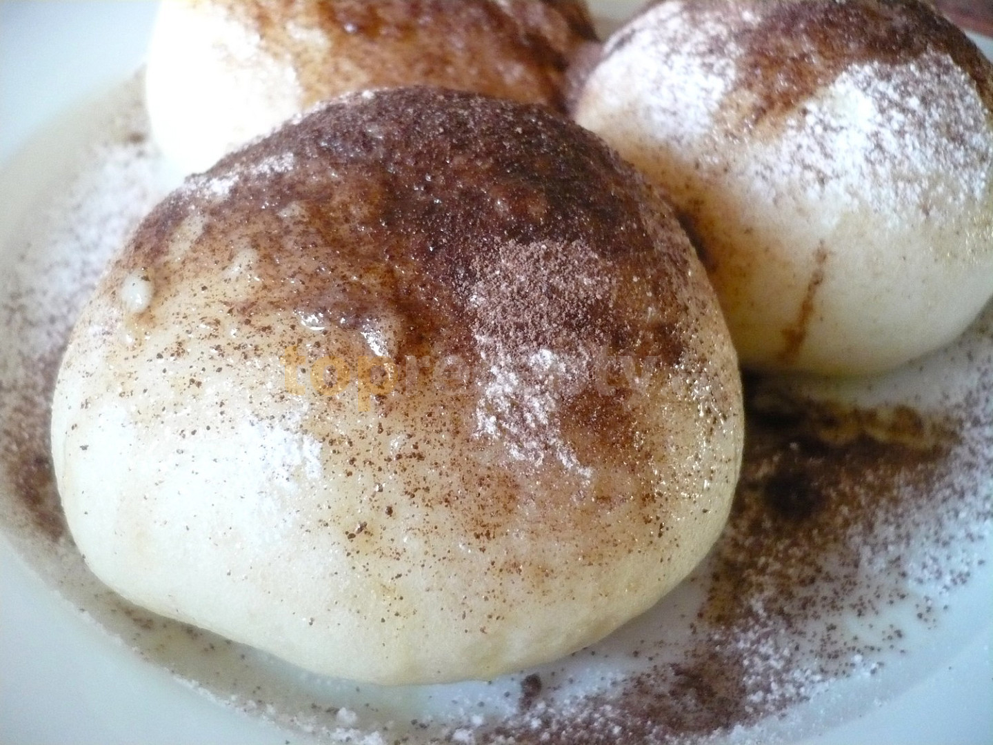 Nahoře posypáno jemnou granulovanou čokoládou, cukrem a přelité máslem.