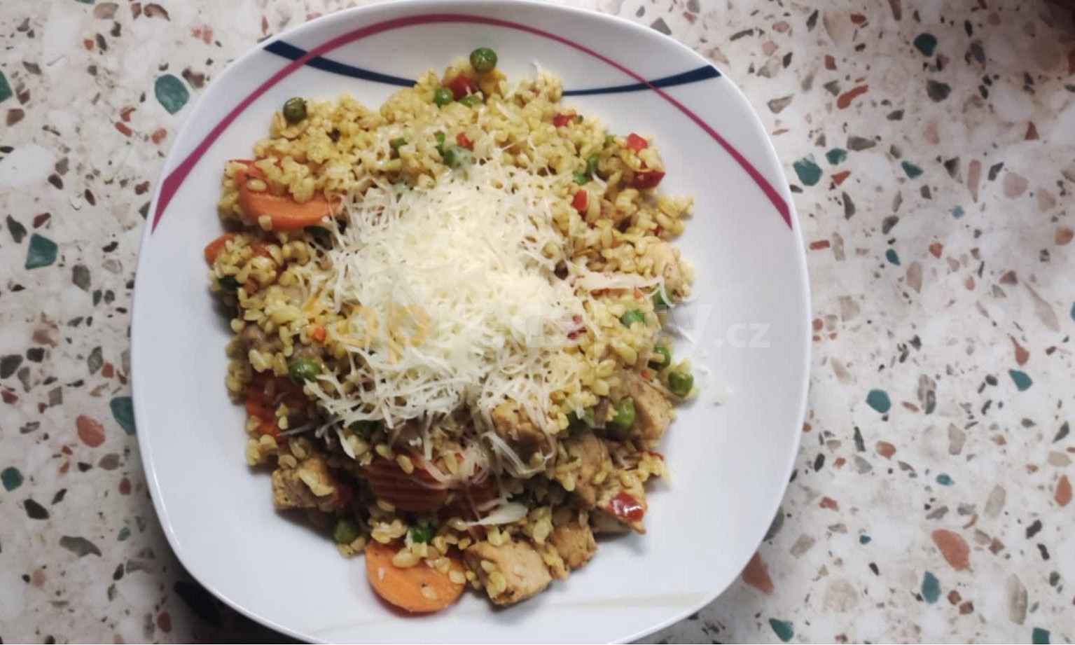bulgur, vývar zeleninový, koření kari, koření polévkové, chilli, směs zeleninová mražená, prsa kuřecí, koření na kuře, omáčka sojová, omáčka worcesterová, koření kari, olej, sůl, pepř mletý, sýr tvrdý
