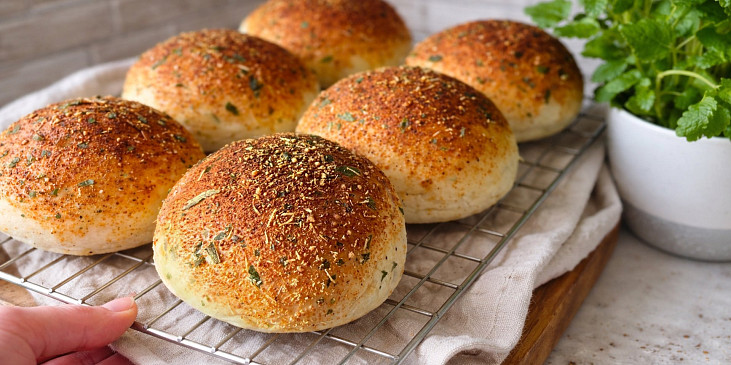 mouka hladká, voda, mléko, máslo, cukr krupice, droždí čerstvé, sůl, vejce, posýpka, sýr parmazán strouhaný, petrželka, česnek sušený, pepř mletý