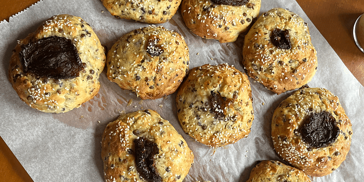 sýr balkánský, čočka beluga, mouka hladká, kypřící prášek do pečiva, vejce, jogurt řecký, máslo, olej olivový, sůl, česnek, koření oregáno, koření provensálské, olivy, rajče sušené, semínka sezamová, semínka lněná, pepř mletý