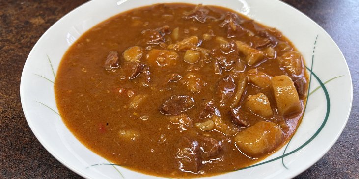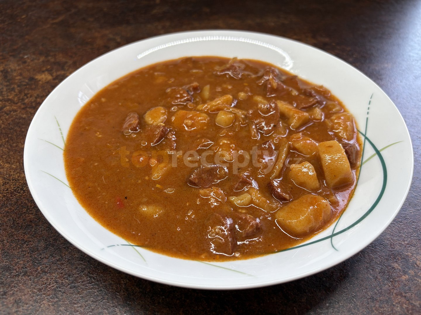 cibule, brambory, zelí kysané, paprika, buřt, česnek, sádlo, paprika sušená sladká, protlak rajčatový, sůl, pepř mletý