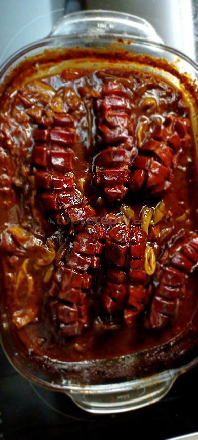 buřt, cibule, cibule šalotka, paprika, rajče cherry, pivo černé, hořčice plnotučná, protlak rajčatový, kečup sladký, tymián, bazalka čerstvá, pepř