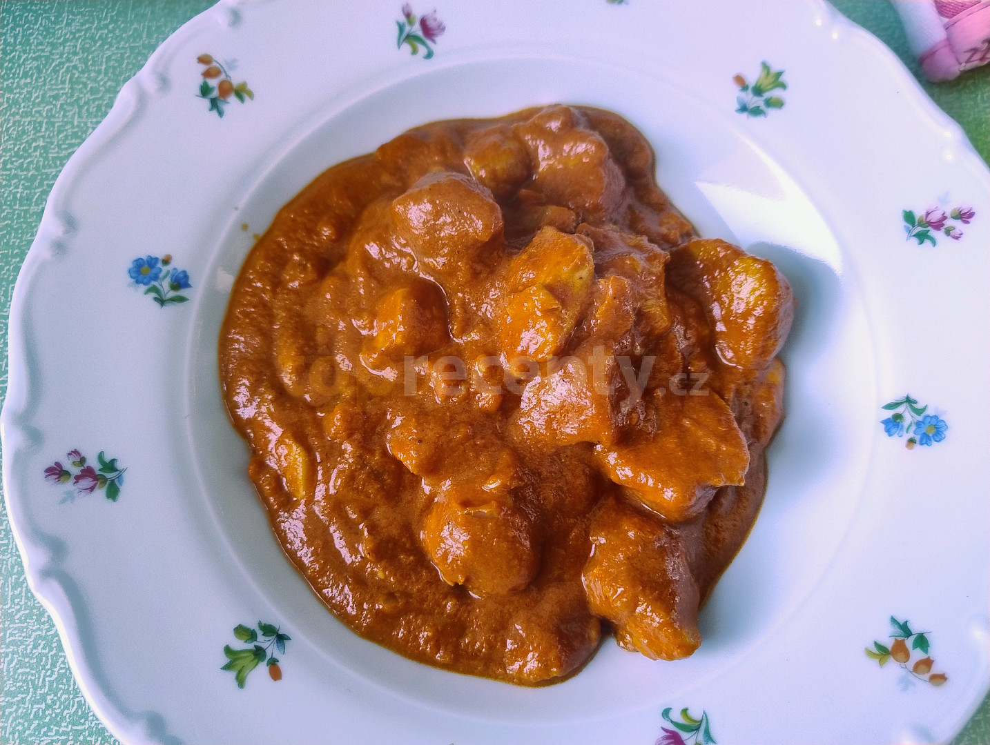 prsa kuřecí, jogurt bílý, pasta kari červená, olej rostlinný, cibule, česnek, zázvor čerstvý, passata rajčatová, smetana, máslo, cukr krupice, koření garam masala, římský kmín mletý, chilli, koriandr sušený, řecké seno, sůl