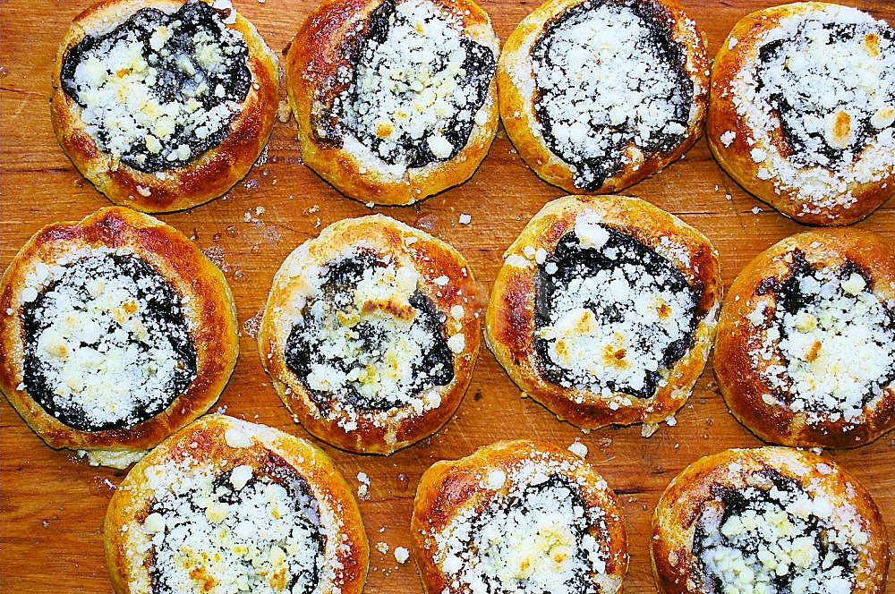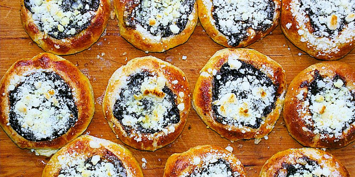 mouka polohrubá, sádlo, mléko, droždí čerstvé, cukr krupice, máslo, žloutek, smetana ke šlehání, sůl, tvaroh, pudink vanilkový, rozinky, rum, cukr moučkový, sůl, kůra citronová, vanilka, povidla švestková, badyán, mouka hrubá, ghee, cukr moučkový, vejce