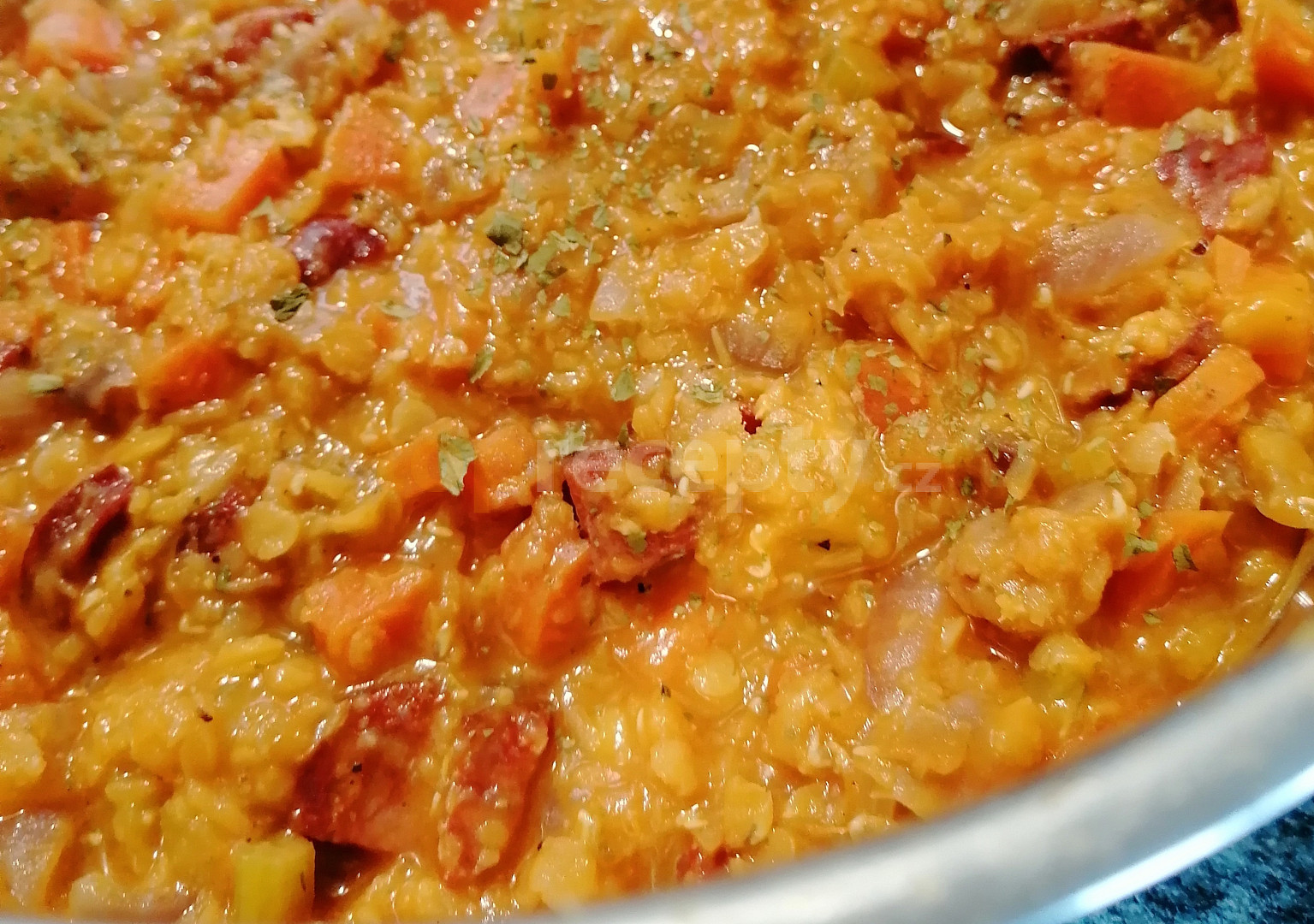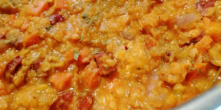 čočka červená, klobása pikantní, cibule, česnek, mrkev, celer, vývar zeleninový, bobkový list, sůl, pepř mletý, chilli, olej