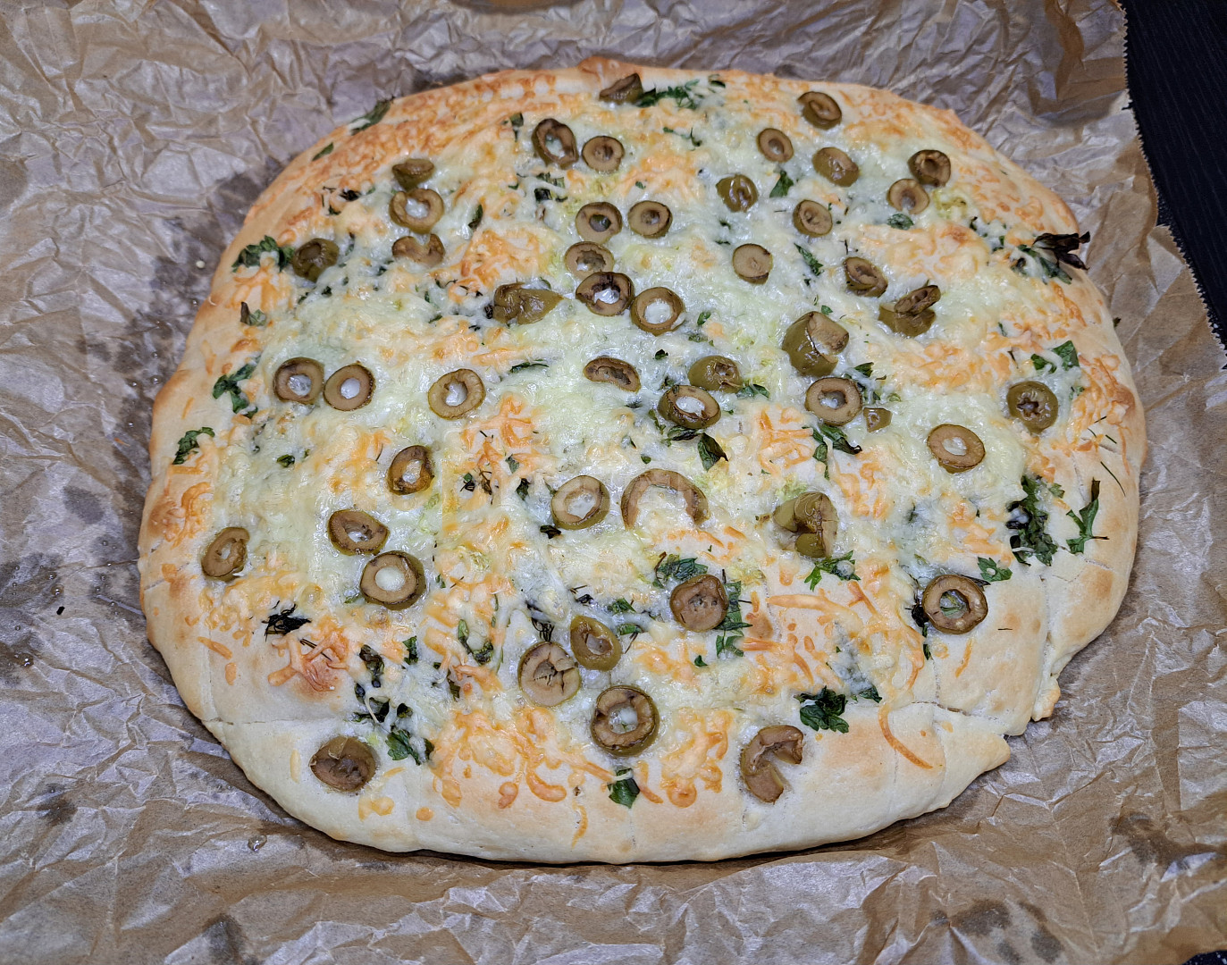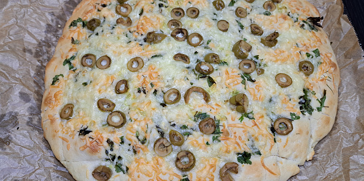 mouka hladká, droždí sušené, voda, cukr krystal, mouka hladká, sůl, olej olivový, olej olivový, petržel, česnek, sýr strouhaný, kopr čerstvý, olivy