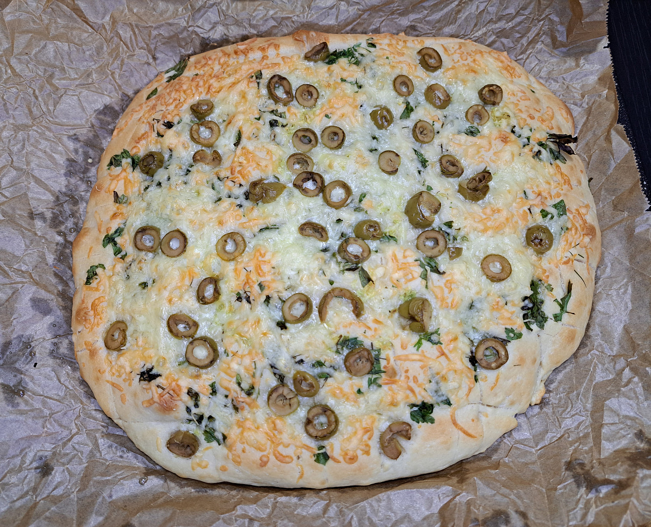 mouka hladká, droždí sušené, voda, cukr krystal, mouka hladká, sůl, olej olivový, olej olivový, petržel, česnek, sýr strouhaný, kopr čerstvý, olivy