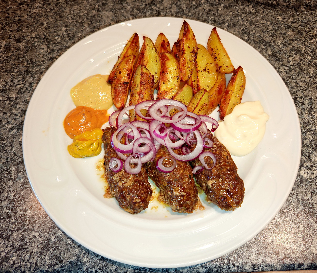maso vepřové mleté, maso hovězí mleté, vejce, cibule, česnek, kmín drcený, paprika sušená uzená, kečup sladký, hořčice plnotučná, majoránka, strouhanka, sůl, pepř mletý, olej, voda, cibule červená