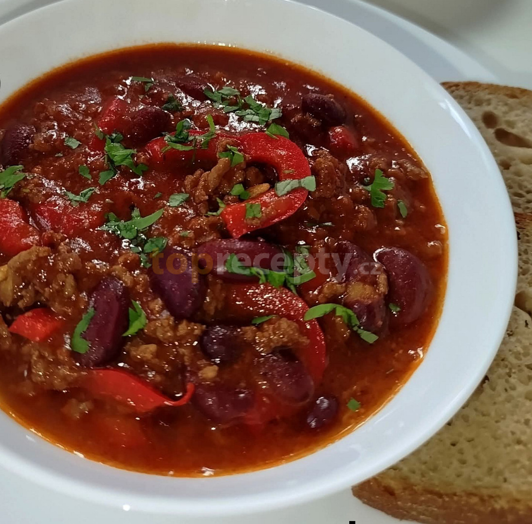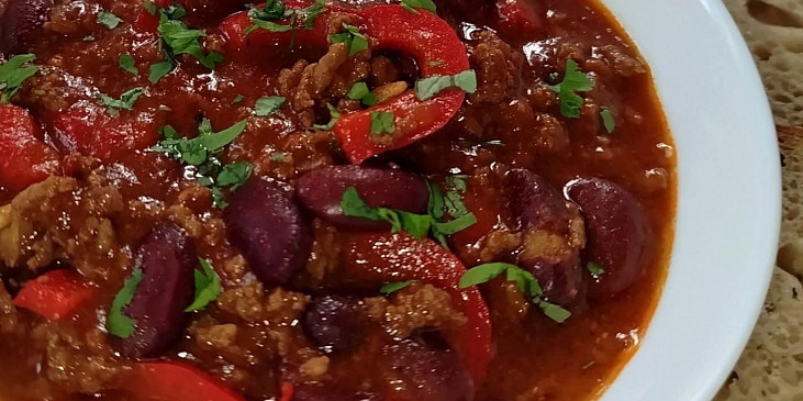 maso hovězí mleté, rajče, cibule, fazole červené, chilli paprika čerstvá, koriandr sušený, římský kmín mletý, koření mexiko, skořice, čokoláda hořká, olej, sůl,