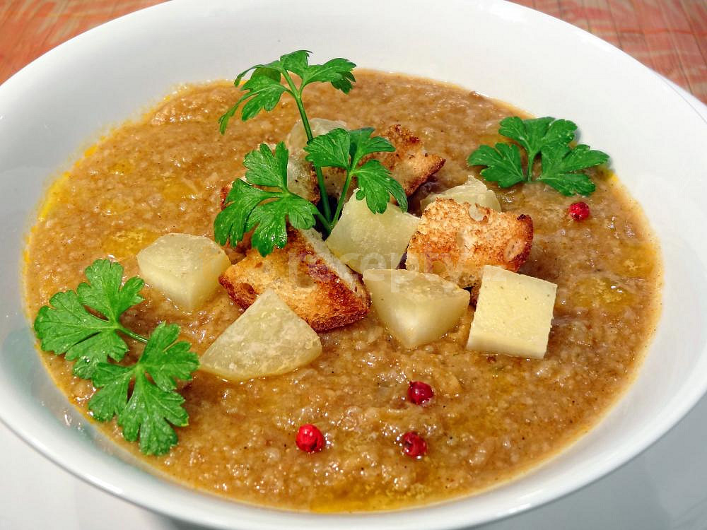 chléb, cibule, sádlo, paprika sušená sladká, pivo světlé, vývar masový, česnek, sůl, pepř mletý, petrželka, rohlík, máslo, sýr tvarůžky kulaté
