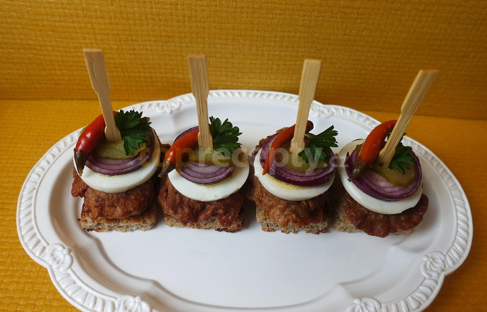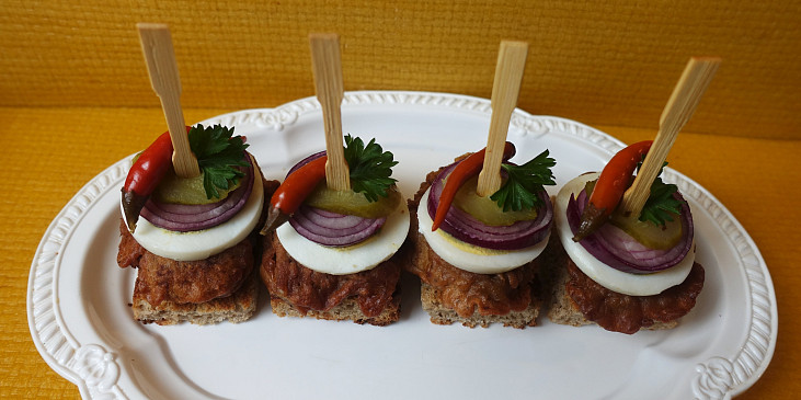 prsa kuřecí, vejce, pivo světlé, omáčka sojová, hořčice plnotučná, škrob, mouka hladká, česnek sušený, sůl, pepř mletý, olej, vejce, cibule červená, okurky sterilované, chilli paprika čerstvá, chléb, česnek, petrželka