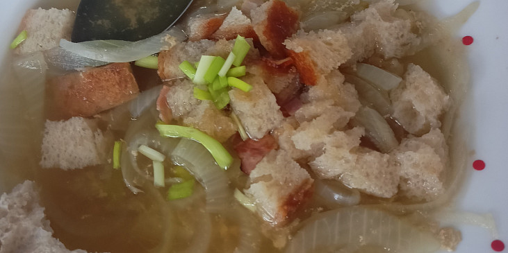 vývar hovězí, cibule, vejce, sůl, pepř, chléb, slanina, pažitka