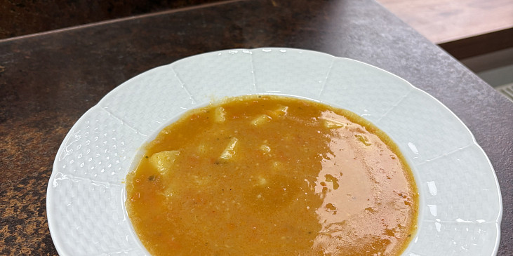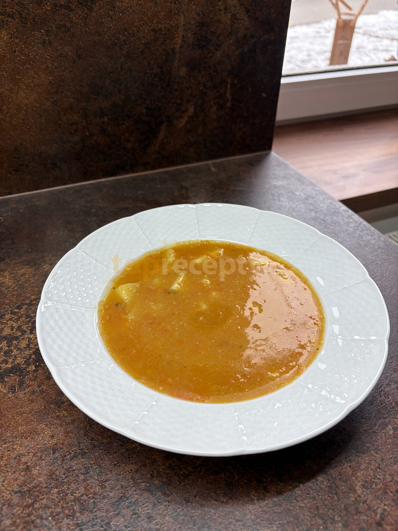 cibule, česnek, brambory, mrkev, vývar masový, máslo, paprika sušená sladká, mouka hladká, libeček sušený, sůl, pepř mletý