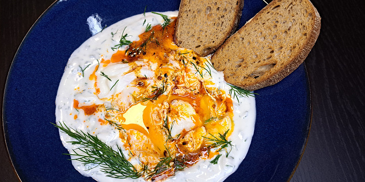 česnek, jogurt řecký, čerstvé bylinky, máslo, paprika sušená sladká, vločky chilli, vejce, ocet, sůl, pepř mletý, citron, chléb