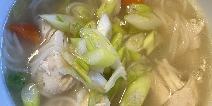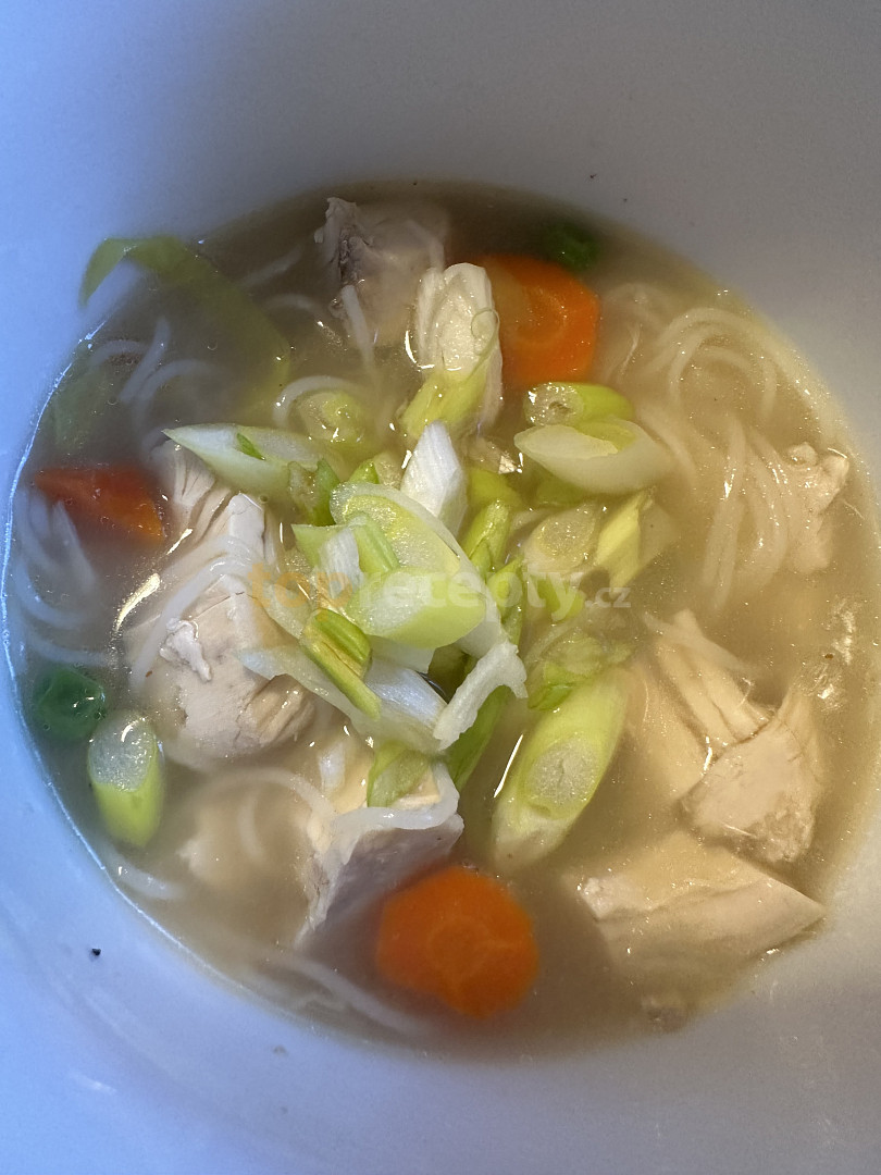 skelet kuřecí, bobkový list, koření nové koření, cibule, koření hřebíček, mrkev, pórek, nudle čínské bezvaječné, hrášek sterilovaný, sůl, pepř mletý