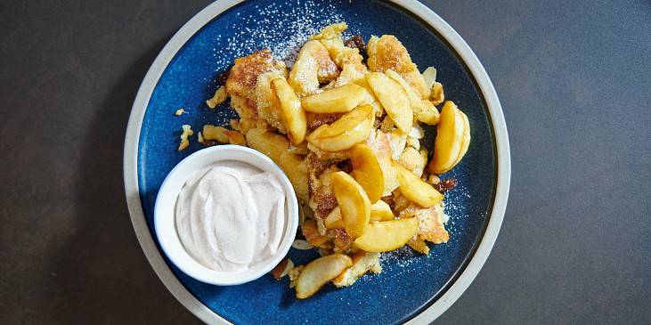 mouka hladká, cukr moučkový, mléko, vejce, rum, kypřící prášek do pečiva, rozinky, lupínky mandlové, citron, ghee, máslo, sůl, jablko, cukr krupice, smetana zakysaná, skořice mletá