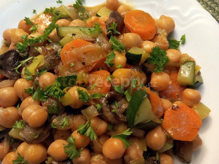 cizrna, cibule, olej olivový, mrkev, pórek, cuketa, celer, houby čerstvé, vývar masový, sůl, kmín drcený, pepř mletý, petrželka