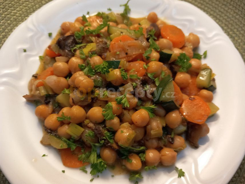 cizrna, cibule, olej olivový, mrkev, pórek, cuketa, celer, houby čerstvé, vývar masový, sůl, kmín drcený, pepř mletý, petrželka