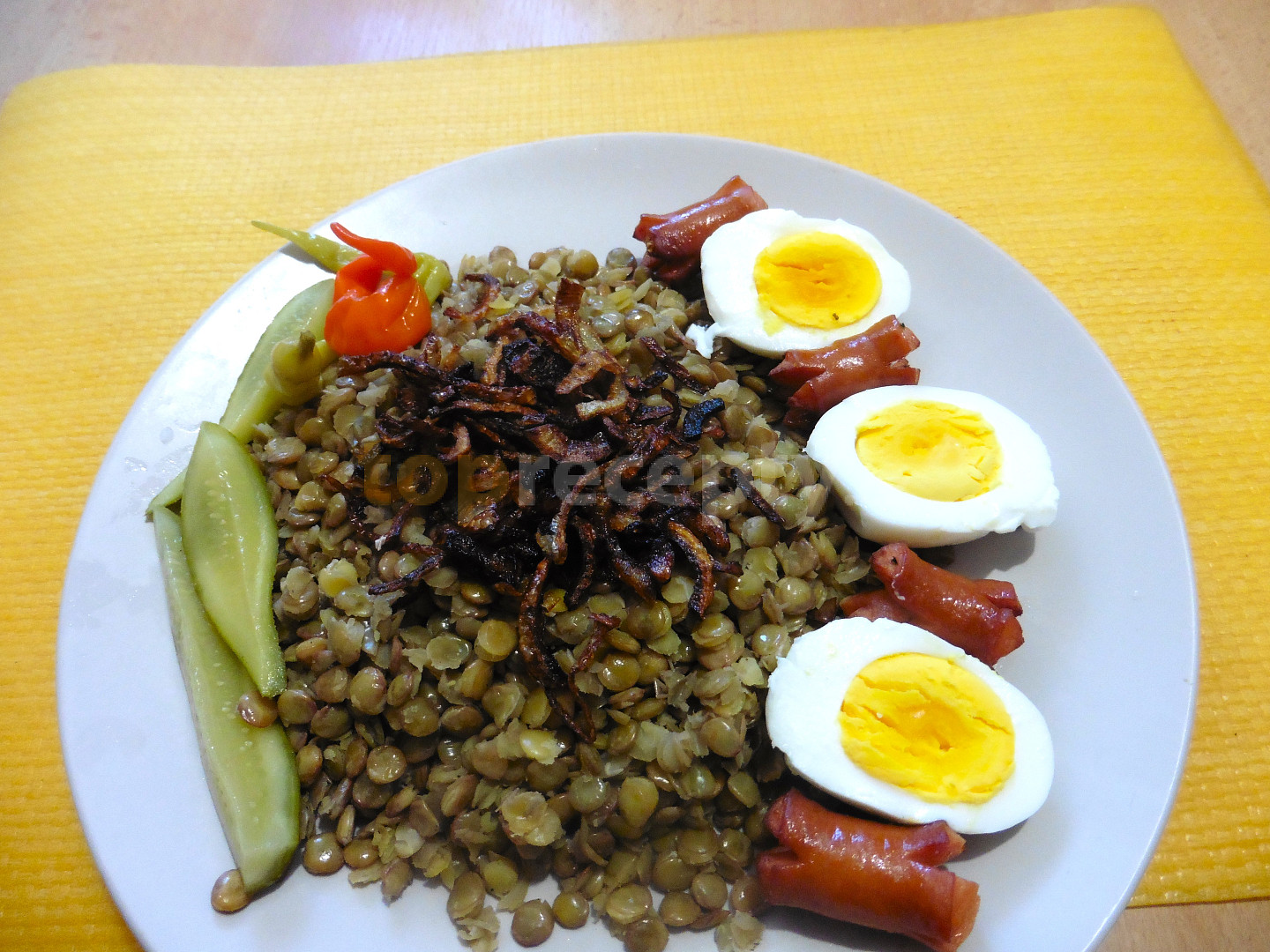 čočka předvařená, koriandr, pepř černý, koření nové koření, rozmarýn, bobkový list, sůl, cibule, klobása pikantní, olej citronový, ocet jablečný, ocet, voda, tuk