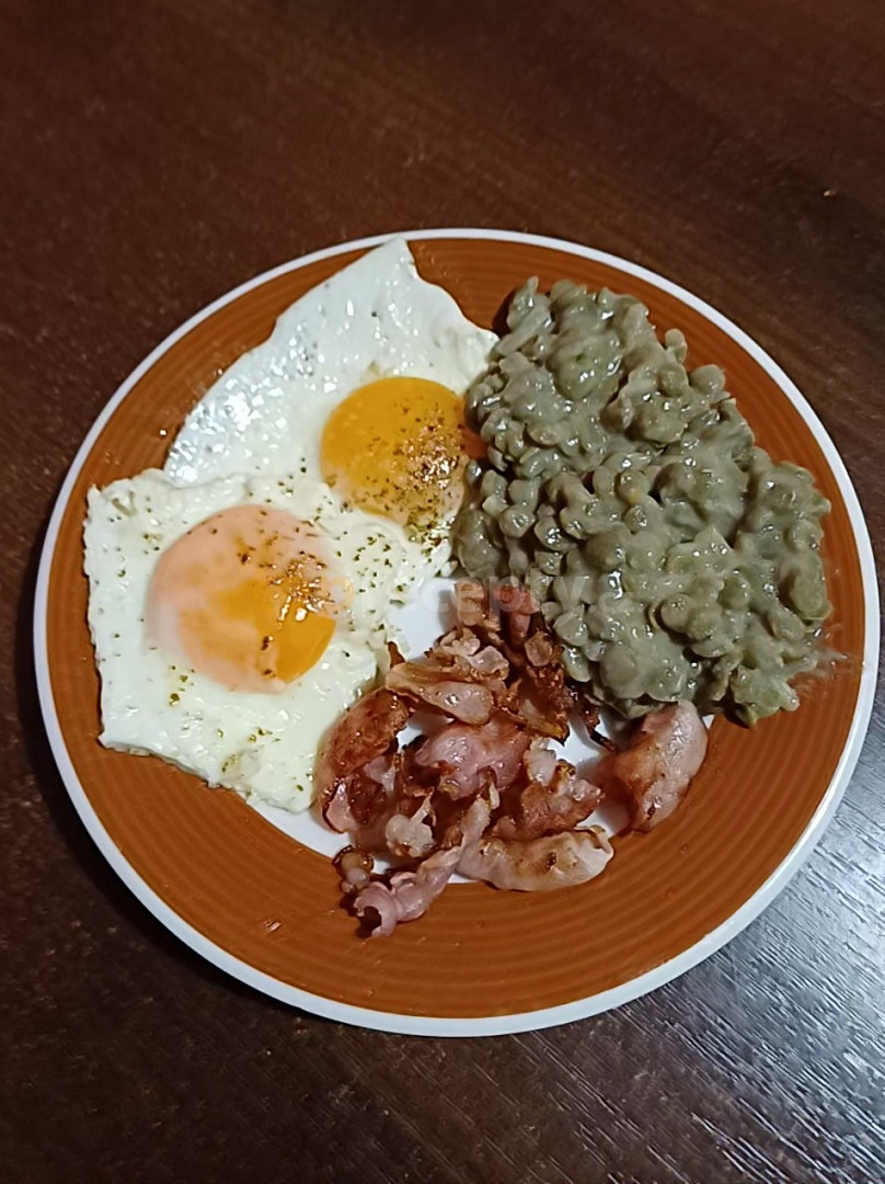čočka, sádlo, cibule, mouka hladká, ocet, sůl, koření polévkové, vejce, slanina, cibule, okurky sterilované