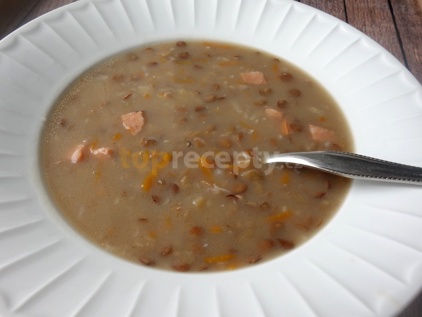 čočka, zelenina kořenová, cibule, olej, uzenina, mouka hladká, sůl, pepř mletý, bobkový list, česnek, majoránka, bujón slepičí, podravka, petrželka