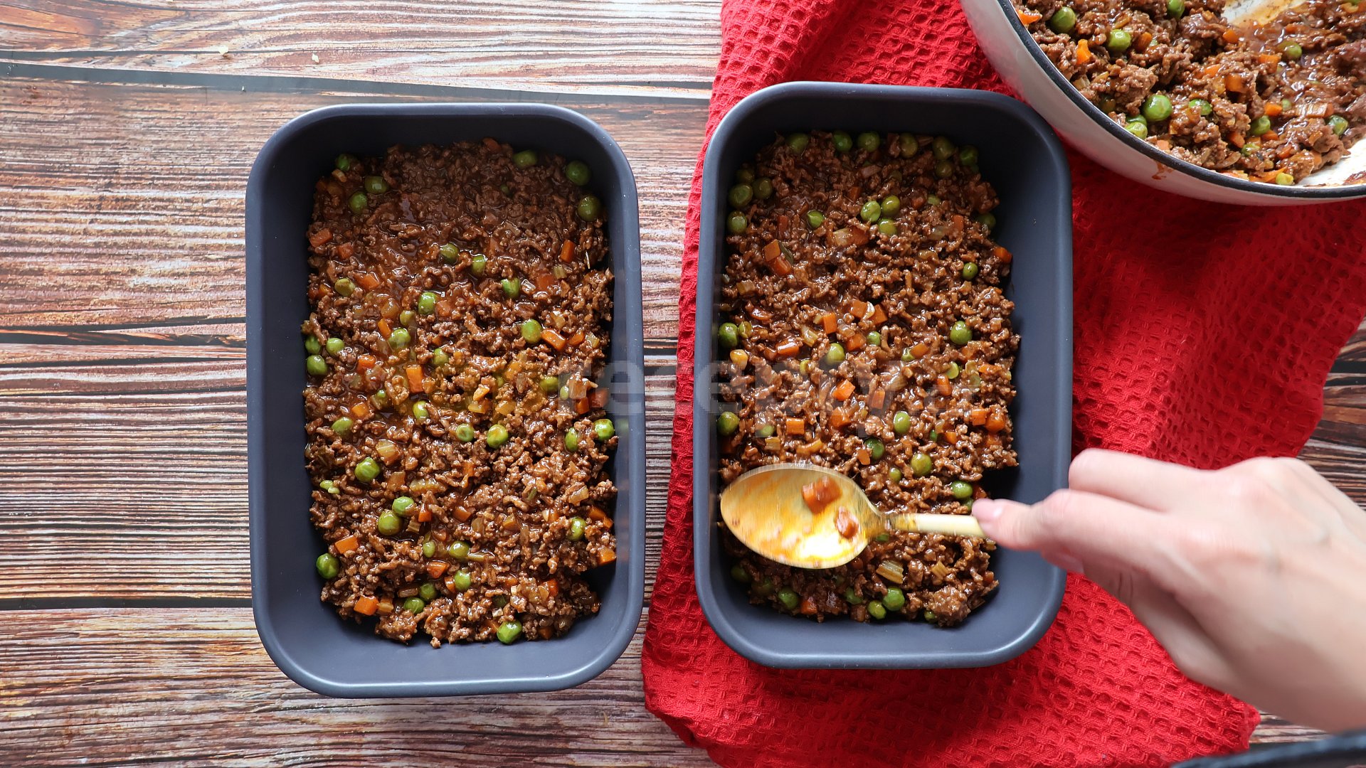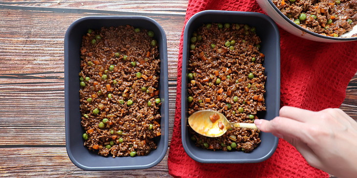 maso hovězí mleté, vývar hovězí, hrášek, víno červené, mrkev, celer, cibule, česnek, olej olivový, mouka hladká, protlak rajčatový, omáčka worcesterová, rozmarýn, tymián, omáčka sojová, pepř, brambory, sýr chedar, mléko plnotučné, máslo, žloutek, pepř