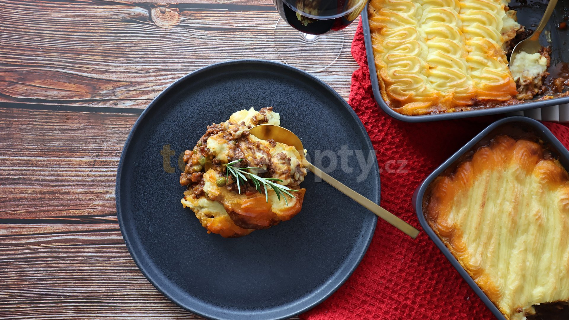 maso hovězí mleté, vývar hovězí, hrášek, víno červené, mrkev, celer, cibule, česnek, olej olivový, mouka hladká, protlak rajčatový, omáčka worcesterová, rozmarýn, tymián, omáčka sojová, pepř, brambory, sýr chedar, mléko plnotučné, máslo, žloutek, pepř