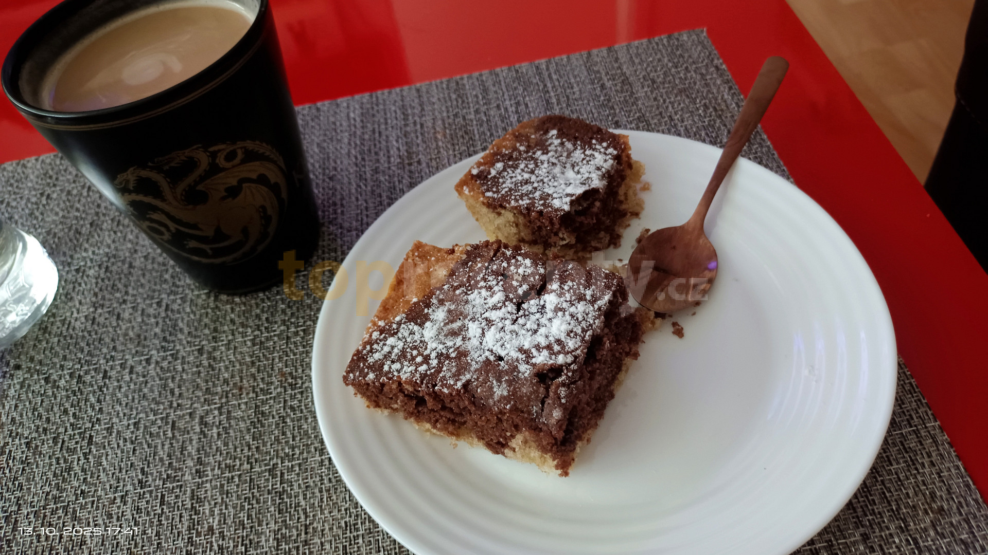 vejce, cukr moučkový, olej, skořice mletá, kakao, mouka polohrubá, kypřící prášek, cuketa strouhaná, tuk hera, cukr moučkový, kakao, mléko, tuk, mouka hrubá