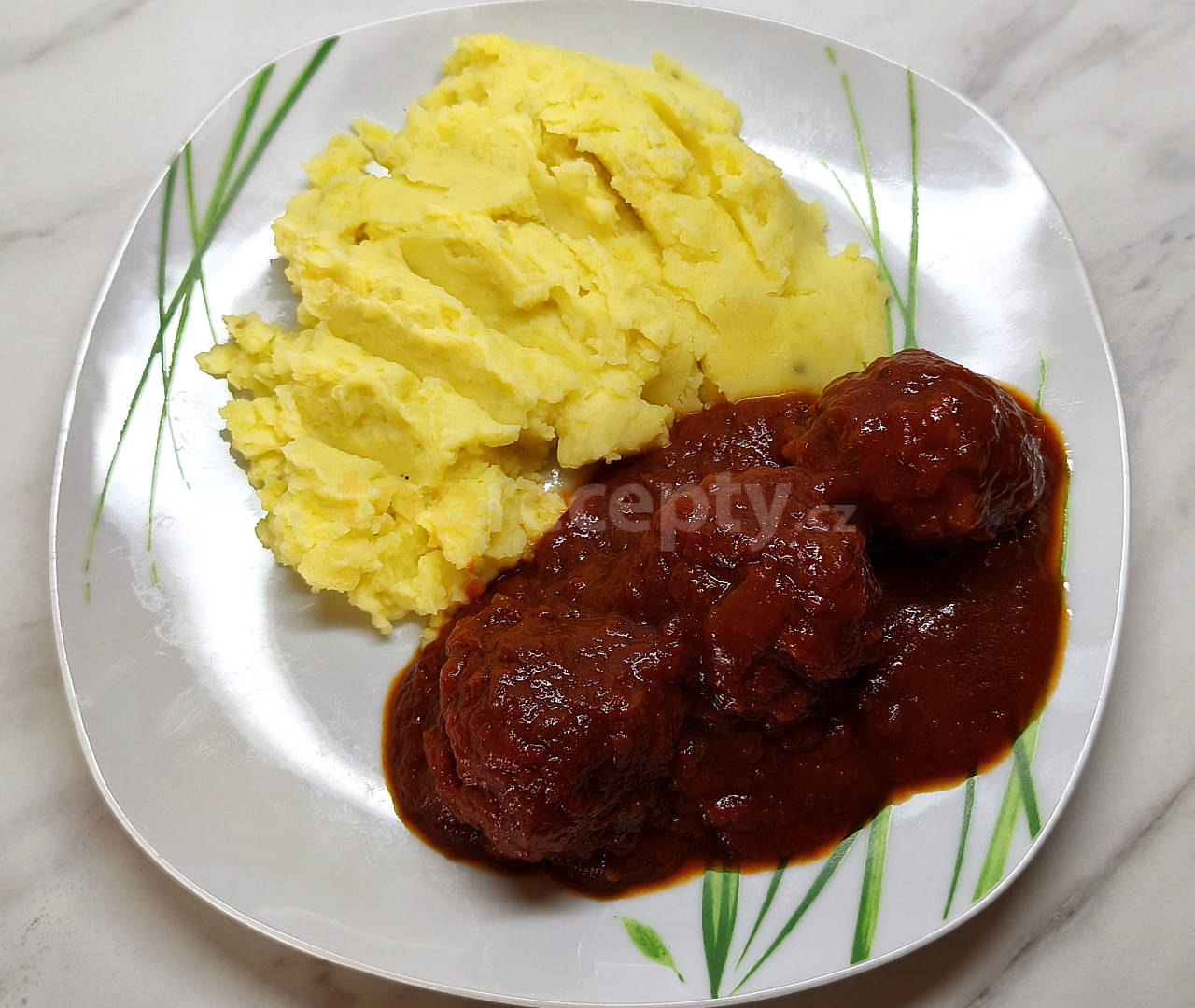 maso mleté, cibule, česnek, rýže, voda, vejce, sůl, pepř mletý, majoránka, petržel, mouka hladká, olej, cibule, cibule, protlak rajčatový, omáčka rajčatová, cukr krupice, vývar hovězí, bobkový list, sůl, pepř mletý, brambory, sůl, mléko, máslo