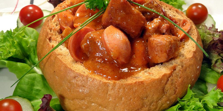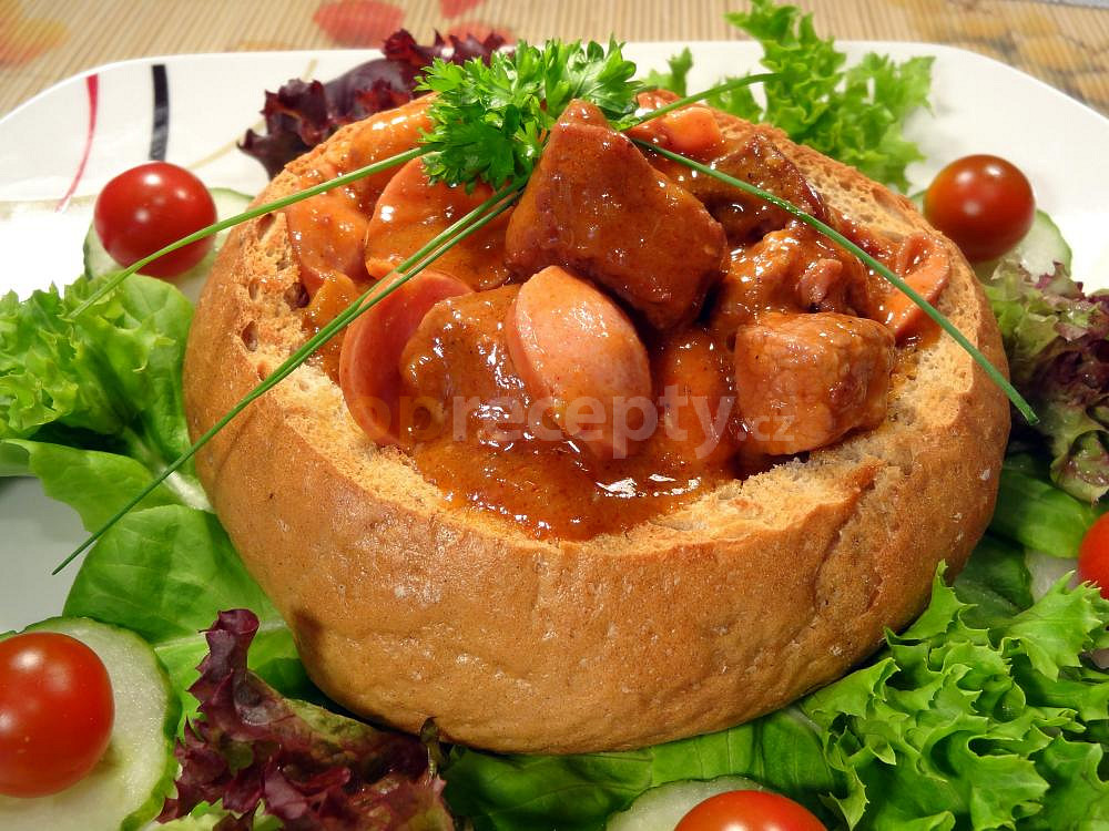 plec vepřová, párky, cibule, mouka hladká, protlak rajčatový, bujón, sůl, pepř mletý, paprika sušená sladká, kmín drcený, bulka chlebová