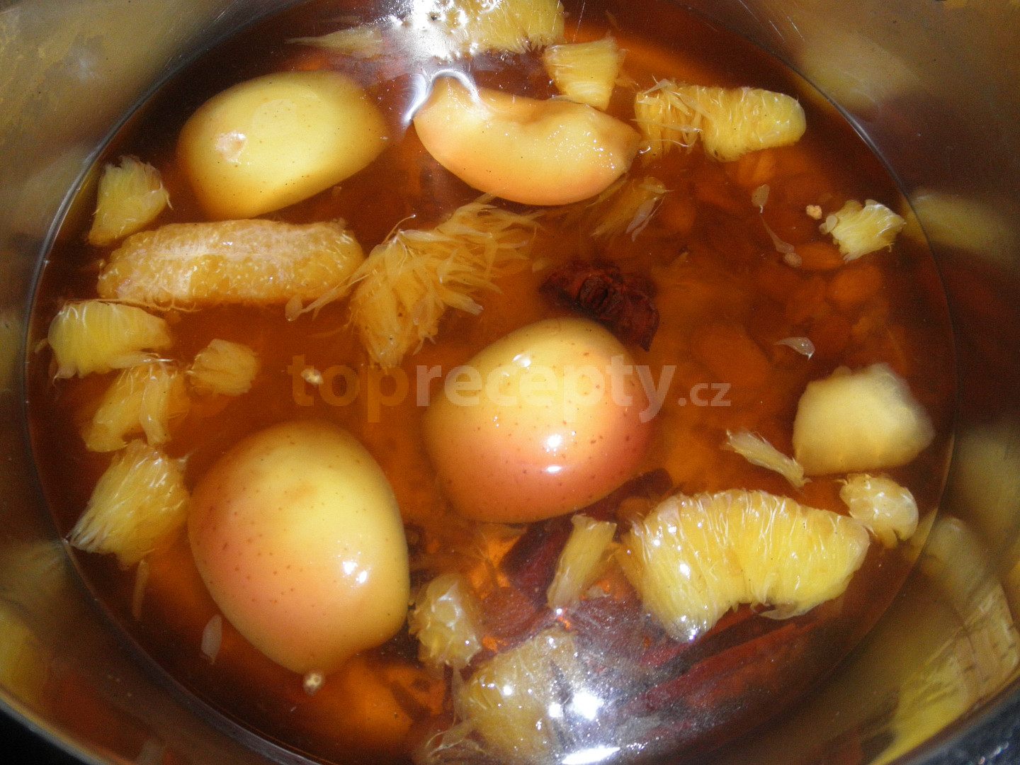 džus jablečný, jablko, pomeranče, badyán, skořice, rozinky, cukr třtinový, koření na svařené víno, vanilka mletá