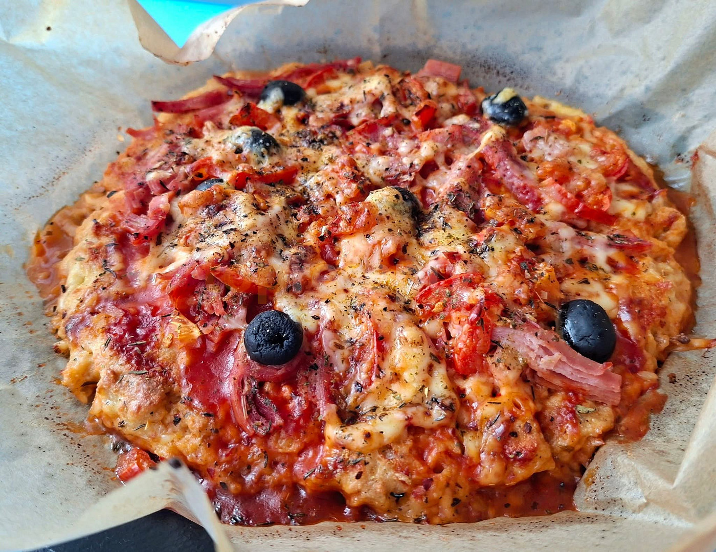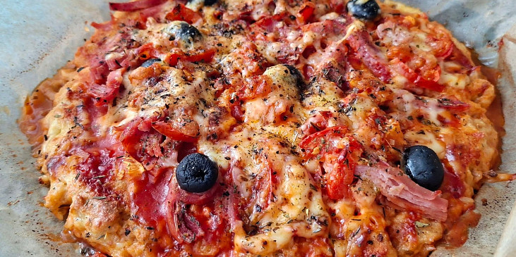 sýr cottage, sýr gouda, čočka červená, vejce, psyllium, olej olivový, pepř mletý, sůl, protlak rajčatový, šunka, rajče, sýr eidam 30 %, olivy, koření pizza