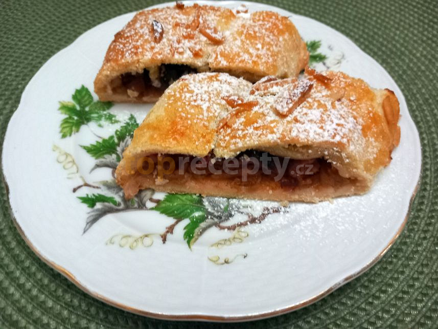 mouka hladká, máslo, jogurt bílý, sůl, jablko, švestky, cukr vanilkový, skořice, vejce, mandle sekané, cukr moučkový