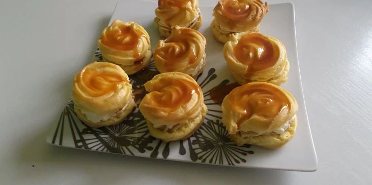 voda, máslo, mouka polohrubá, vejce, sůl, pudink karamelový, mléko, máslo, cukr krupice, smetana ke šlehání, ztužovač šlehačky, cukr krupice, cukr krupice, smetana ke šlehání