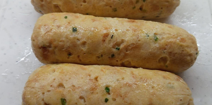 rohlík, mléko plnotučné, máslo, vejce, mouka hrubá, pažitka, nať petrželová, ořech muškátový, pepř mletý, sůl