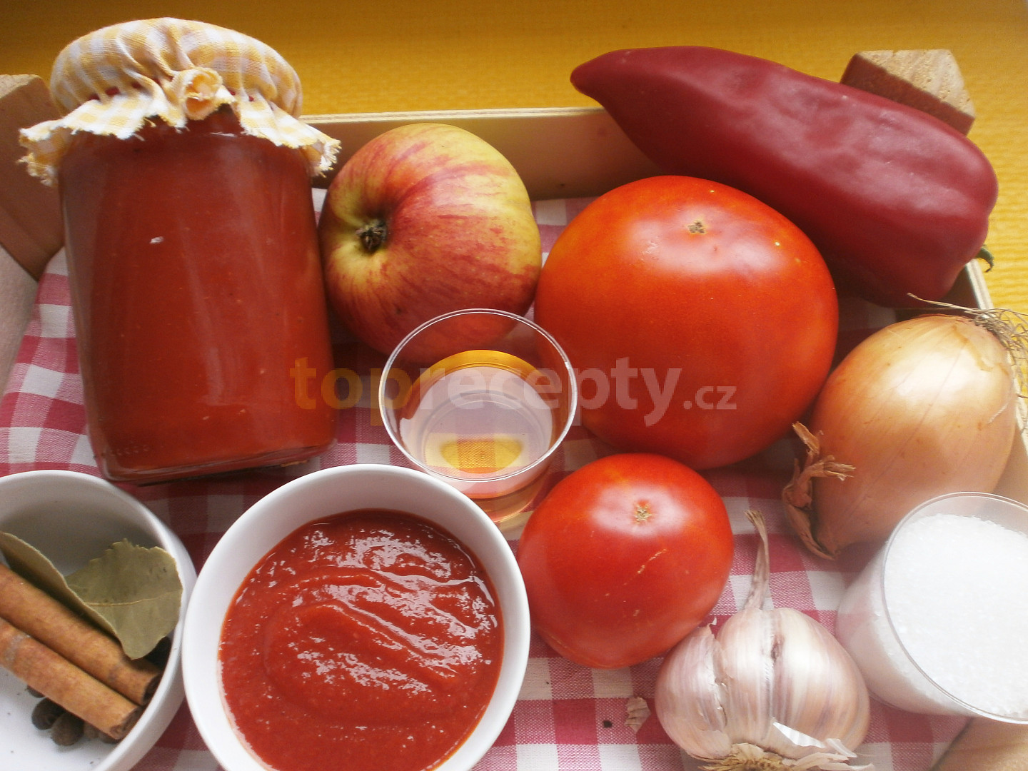 rajče, paprika čerstvá červená, jablko, cukr krystal, cibule, sůl, česnek, ocet, paprika sušená sladká, koření nové koření, koření hřebíček, bobkový list, skořice mletá