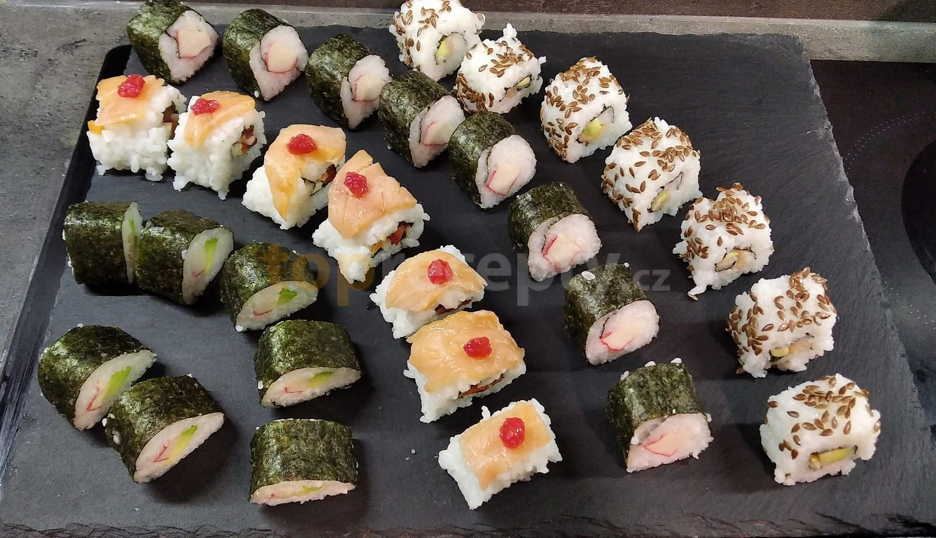 rýže, voda, ocet rýžový, sůl, cukr, losos, tuňák, avokádo, rukola, sýr, omáčka sojová, pasta wasabi, okurka čerstvá, majonéza