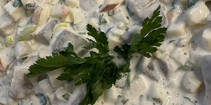 cibule šalotka, jablko, cibulka jarní, smetana zakysaná, majonéza, sůl, pepř mletý, petrželka