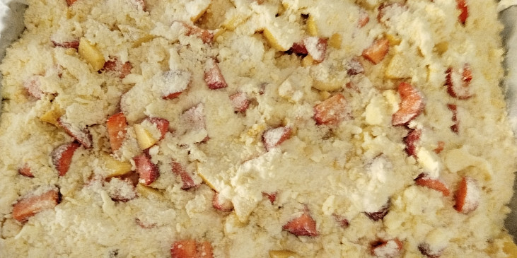 mouka polohrubá, cukr moučkový, tuk hera, vejce, cukr vanilkový, kypřící prášek do pečiva, mléko, pudinkový prášek, cukr krupice, jahody