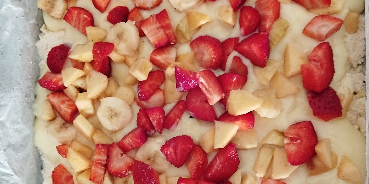 mouka polohrubá, cukr moučkový, tuk hera, vejce, cukr vanilkový, kypřící prášek do pečiva, mléko, pudinkový prášek, cukr krupice, jahody