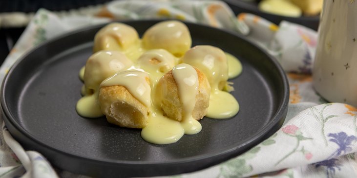 droždí čerstvé, cukr krupice, mléko plnotučné, mouka hladká, sůl, kůra citronová, máslo, vejce, máslo, rum, mléko plnotučné, smetana ke šlehání, lusk vanilkový, žloutek, cukr krupice, rum