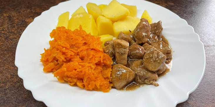 mrkev, vývar zeleninový, máslo, mouka hladká, smetana ke šlehání, ořech muškátový strouhaný, sůl, cibule, plec vepřová, voda, mouka hladká, koření nové koření, pepř mletý, sůl
