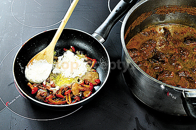 maso hovězí, houby čerstvé, cibule, olej, kmín celý, mouka hladká, smetana, šťáva citronová, cukr krystal, sůl, pepř mletý