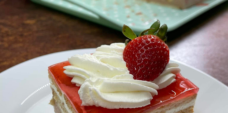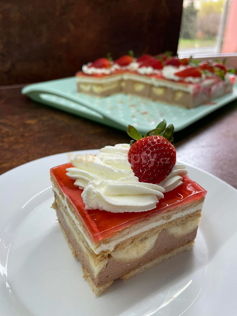 sušenky máslové, tvaroh, smetana zakysaná, cukr, smetana, ztužovač dr. oetkera za studena, čokoláda, banán, želatina, zdobení