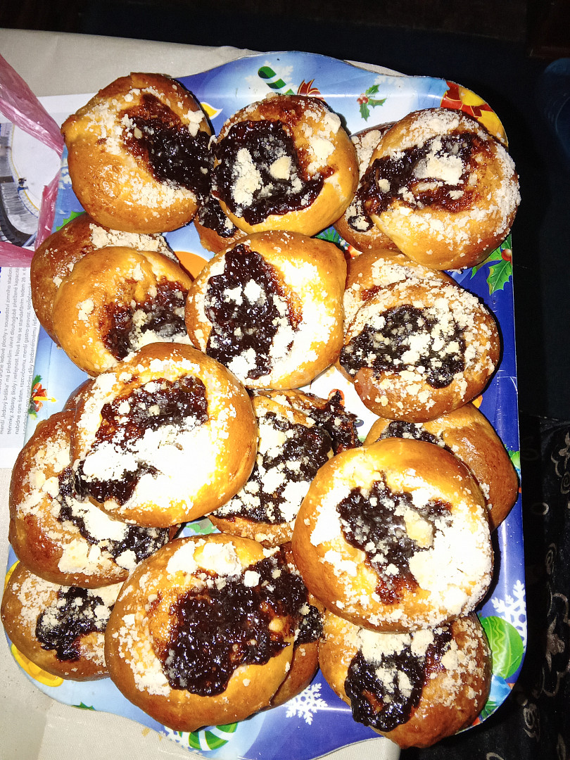 mléko, cukr, droždí čerstvé, mouka polohrubá, cukr moučkový, žloutek, sůl, olej, mouka hladká, tvaroh, vejce, cukr, bílek, povidla švestková, žmolenka